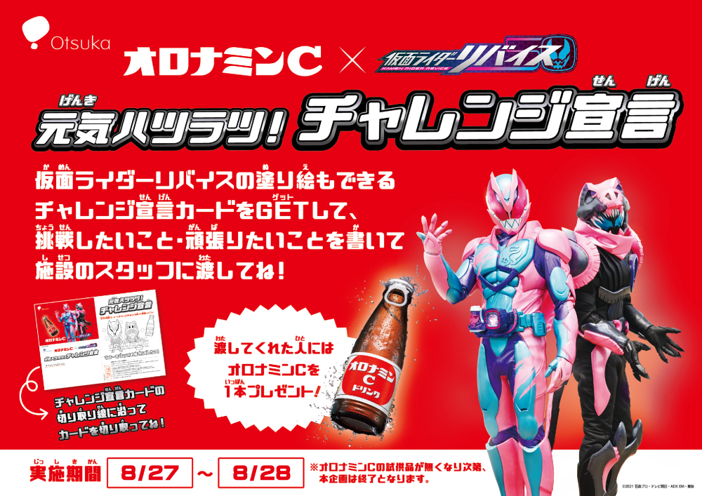 元気ハツラツ!チャレンジ宣言は、20周年を迎えるオロナミンCと生誕50周年の仮面ライダーシリーズの夢のコラボ企画です。